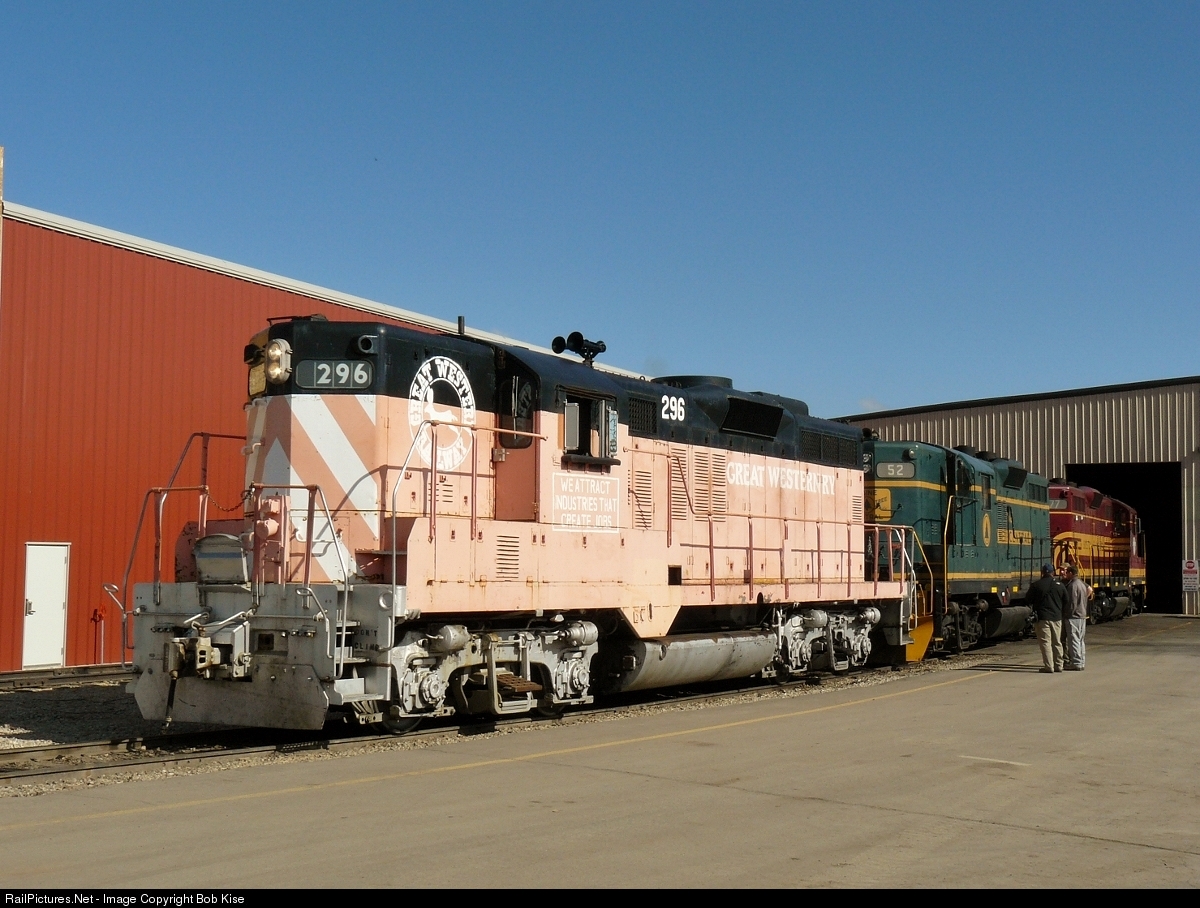 | Heber Valley's ex-Great Western GP9 (Union Pacific 296, built 1954) is coupled to Pan Am heritage units MEC 52 and BM 77 outside the shop door at Heber City. The original GW orange paint has faded to a pink hue. |