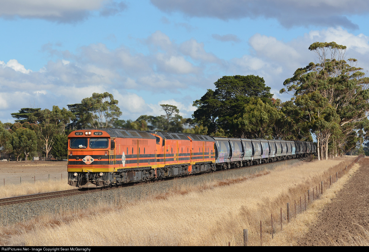 | An unusual sight of a GWA grain train running into Victoria is witnessed here as ALF20, CLP17 & ALF18 work 3AK1 through Lismore. The train left Dry Creek in Adelaide the previous day before loading at Tailem Bend with the grain then being delivered to North Geelong for export. |
