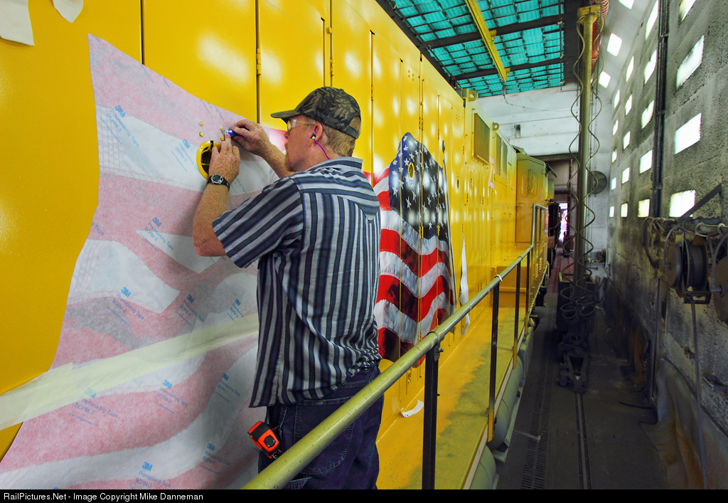 Union Pacific ES44AC No. 5401 has lettering and graphics applied inside the paint shop at the Downing B. Jenks Shop at North Little Rock, Arkansas, by painter (carman by trade) Gary Dunlap on May 18, 2015. With the massive size of a locomotive, one can easily overlook that the large Scotchlite flags have to be tediously cut to each engineroom door and around other impediments like hinges and latches.