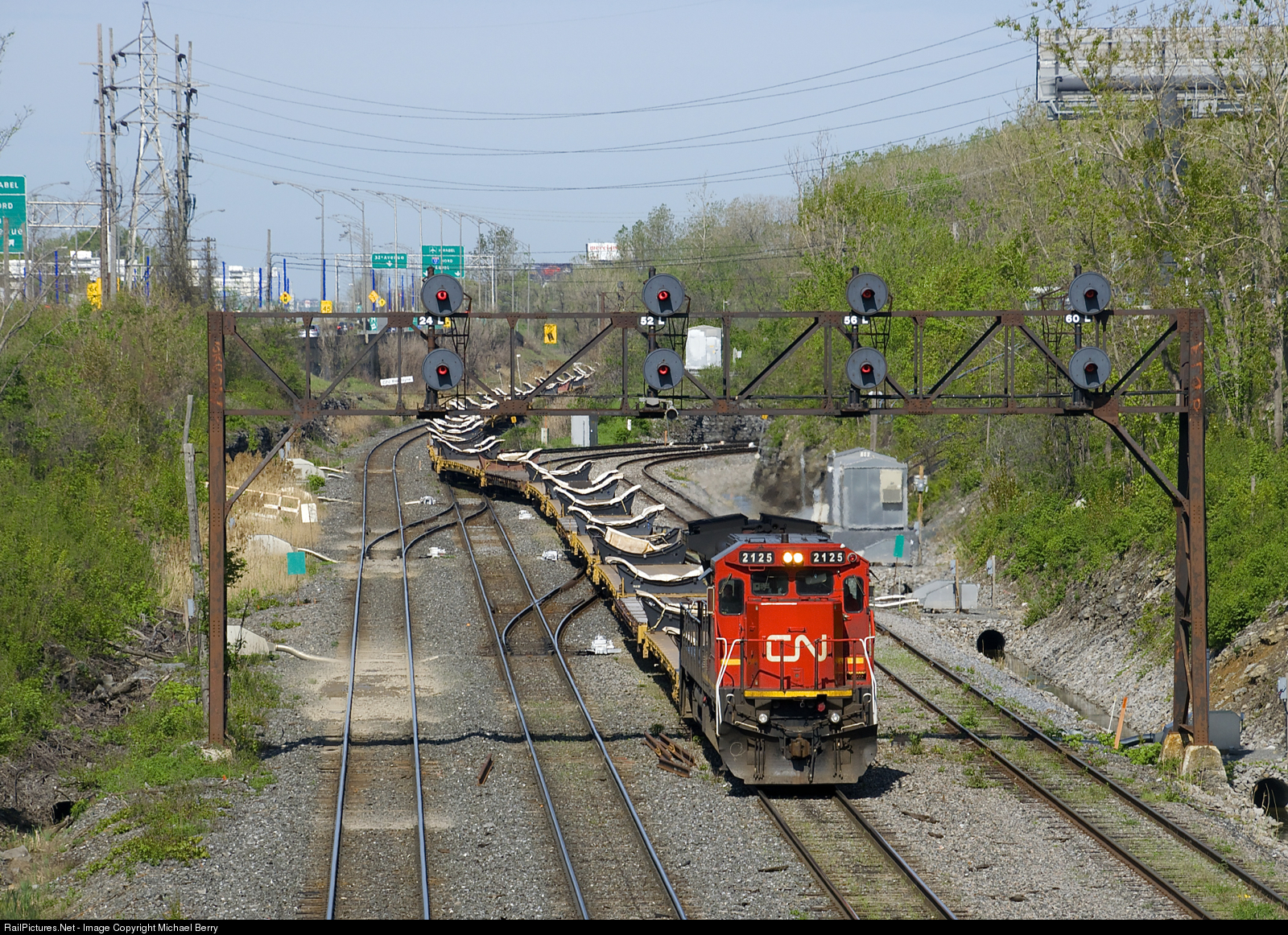 | With CN 310 stopped on the north track up ahead at Turcot Ouest to change crews, CN X308 is crossing from the north to the freight track at Ballantyne (it will change crews there as well). CN 2125 is the sole power on this train of empty flats, heading back to the QGRY for more windmill towers. |