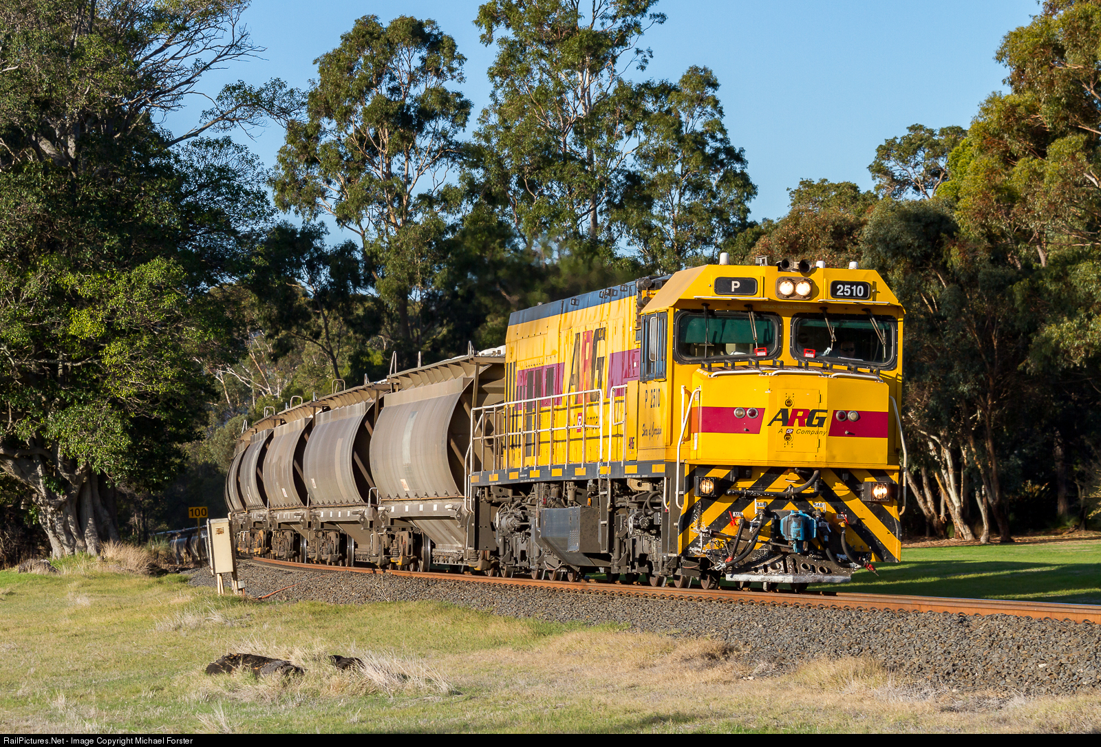 | P2515 is nearly at the end of its journey from Pinjarra to Bunbury Inner Harbour. The train is pulling 34 hoppers loaded with alumina. |