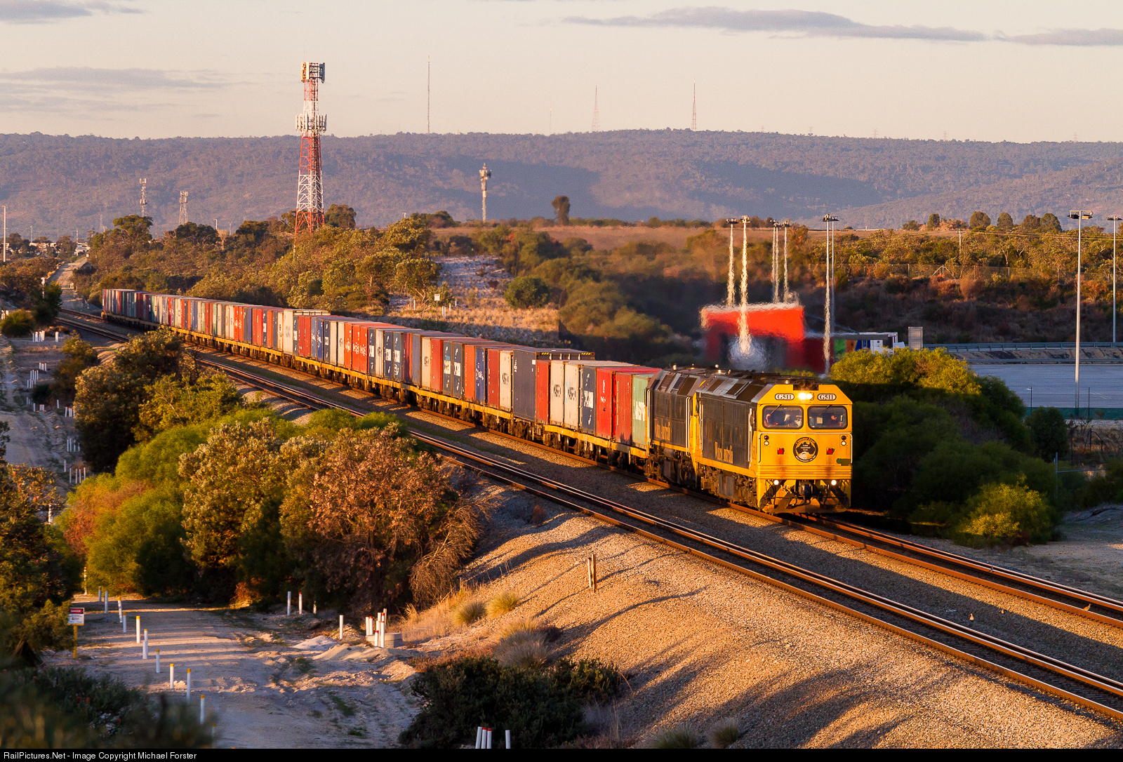| One of Watco's 6 daily Forrestfield to Fremantle ILS trains passes the Aldi distribution center with another load of containers bound for export. |