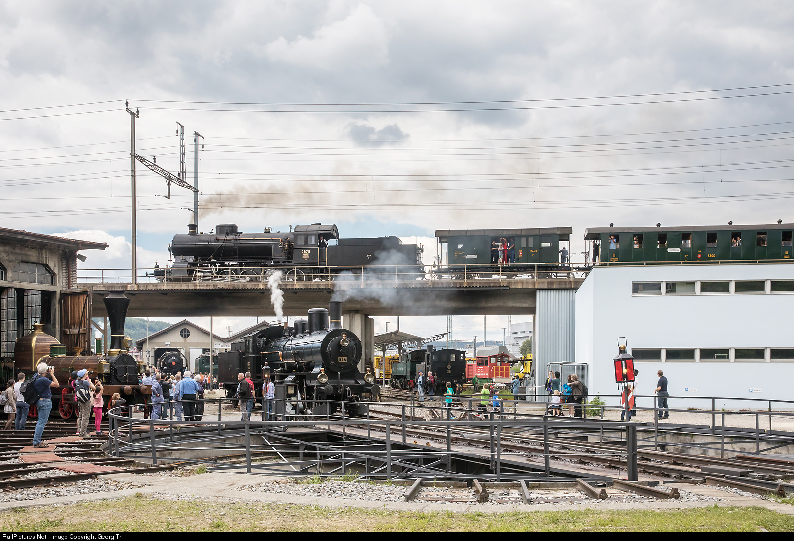 A steam train to Frick with 2-10-0 "Elephant" C 5/6 # 2978 is crossing the Bahnpark Brugg (AG) over the joint line bridge, while 5 other steam locomotives can be seen in the Bahnpark area.