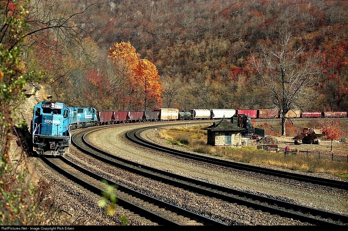 A pair of snappers are ahead of the haulers (a C36-7 and SD50) on a 91 car westbound rounding Horseshoe Curve. Three more SD40s are on the rear of the train. Note the vintage tank car six deep. There weren't many of them left at this point in time. Renovations are underway at the Curve - not for the better in my estimation.