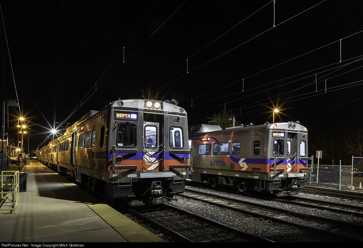 A pair of SEPTA Silverliner V commuter sets await assignment late one Saturday night at Doylestown, PA. Doylestown is the terminus of the line that runs to Philadelphia via Lansdale. The former Reading Company line was built in 1856 by the North Pennsylvania Railroad. Doylestown station, seen here, is one of only two brick and mortar stations along the line to Lansdale, and the sole surviving station built by the Northern Pennsylvania Railroad.