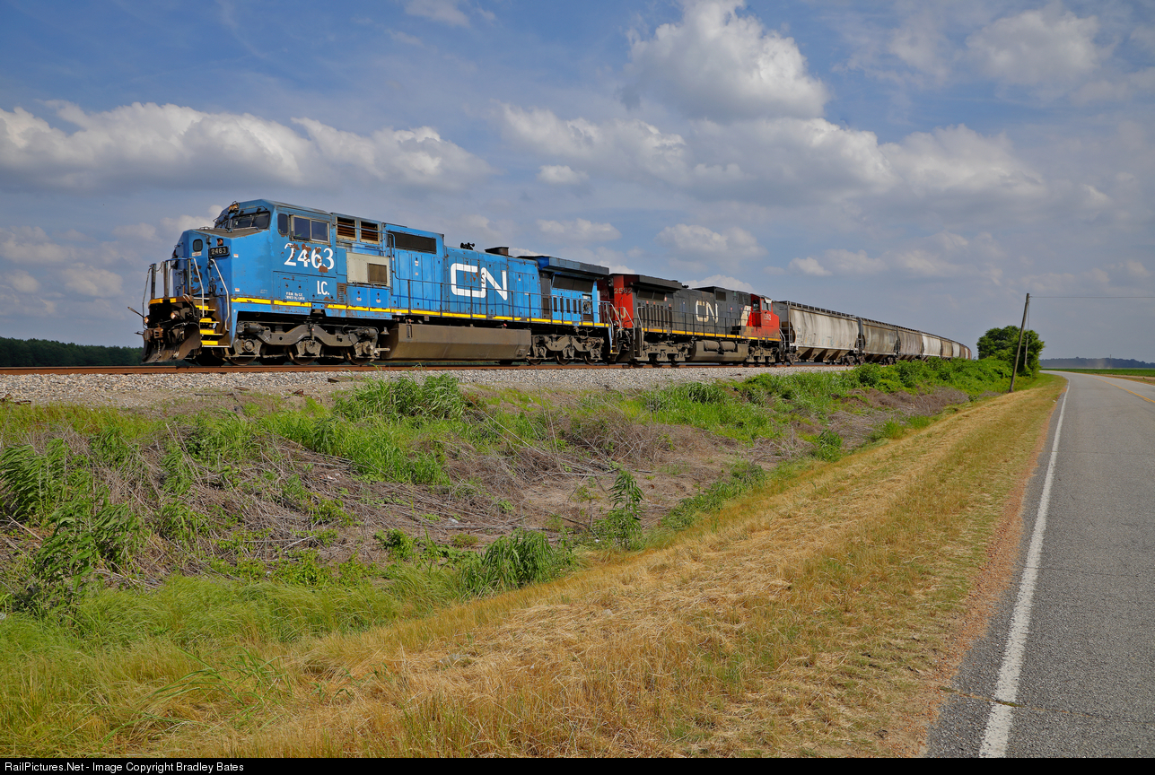 | Canadian National Freight Train A489 heads North through Money, MS, with IC C40-8W #2463 on the point still in its former LMS Blue Paint scheme |
