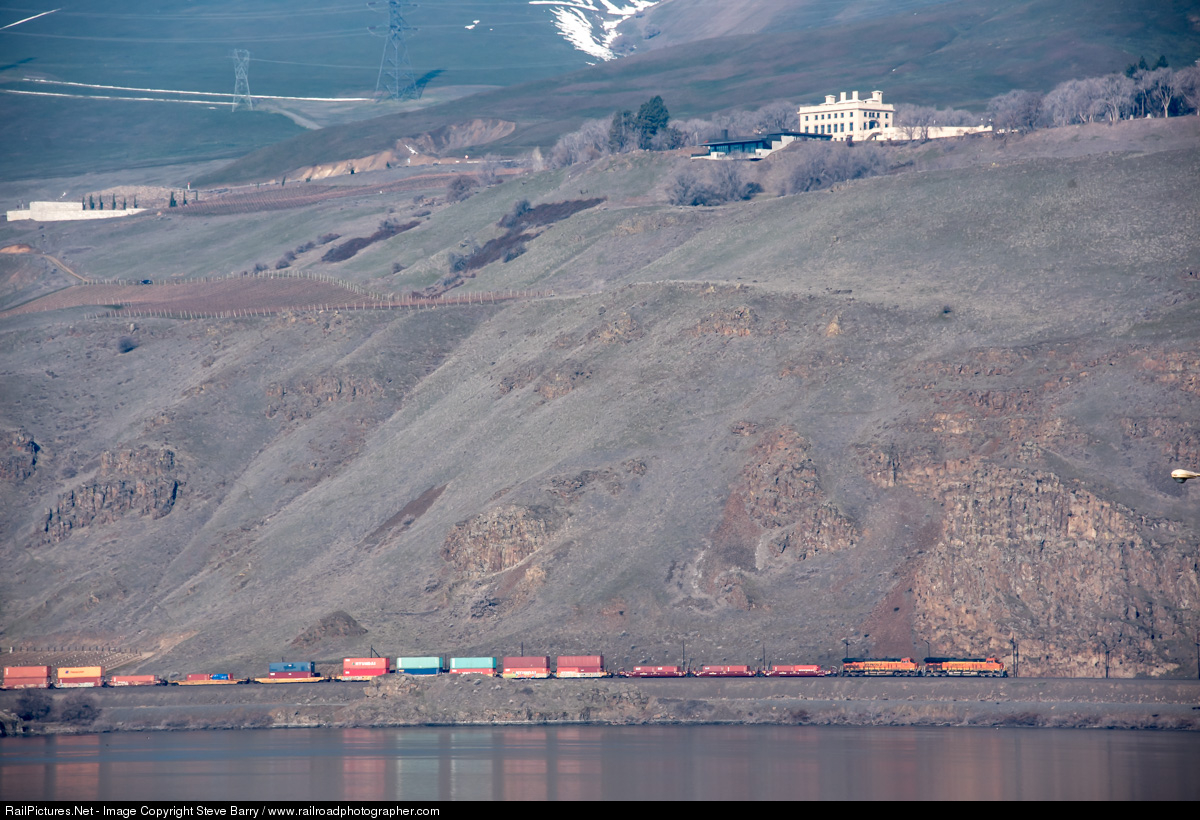 | Seen from the Oregon side of the Columbia River, an eastbound BNSF train passes beneath the bluffs of Maryhill, Wash. |