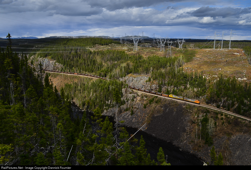 QNS&L GE AC4400CW 420 southbound with a loaded iron ore train at Milepost 12 along the Moisie River