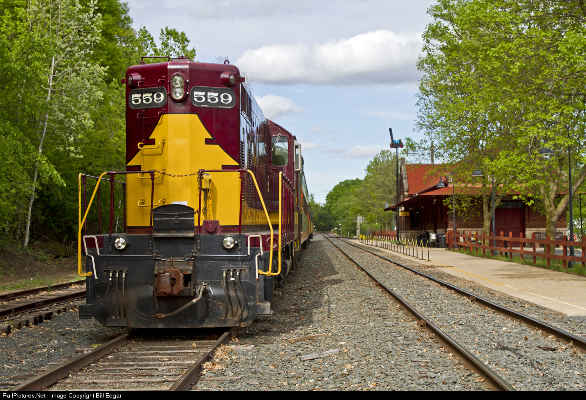 | Soo Line 559 owned and operated by the Minnesota Transportation Museum (thus lettered MNTX), heads up an excursion train at Osceola, WI. The paint scheme is unique in that the "pine tree" was applied to the long hood as well as the short hood on Soo passenger Geeps. The freight Geeps were set up short hood forward and had an extension of the side stripe wrapped around the long hood nose. |