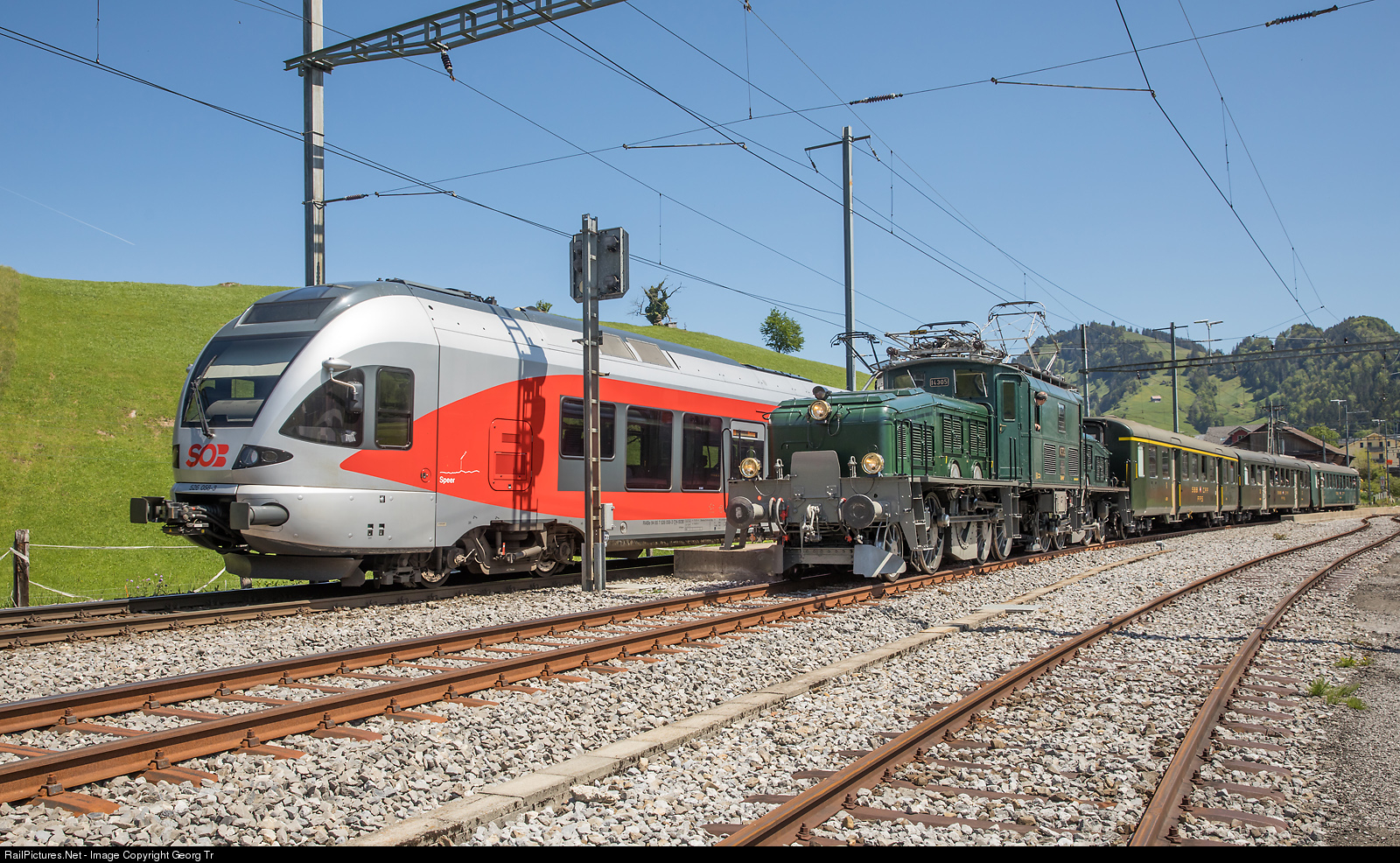 The "crocodile" Ce 6/8 III # 14305 of SBB Historic from 1925 is crossing the "Flirt" RABe 526 # 058 of the Südostbahn at Sattel-Aegeri. # 14305 is on a round trip for retired staff of the SBB from Zürich via Thalwil-Pfäffikon SZ-Biberbrugg-Arth Goldau-Zug-Thalwil back to Zürich.