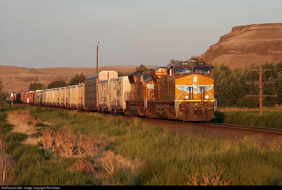| Riding into the Oregon sundown, the 7698 is in charge of a westbound that has crossed the Blues and is on the home stretch toward Hinkle. |