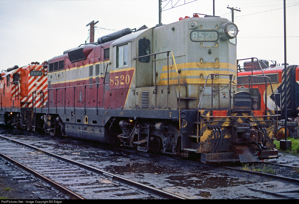 | CP passenger power for the Canadian was not always FP7s or FP9s. Here on a rainy June day in Vancouver, BC, passenger GP9s await there turn at the helm of the famous train. No. 8520 sports its as delivered scheme some two decades after its construction. |