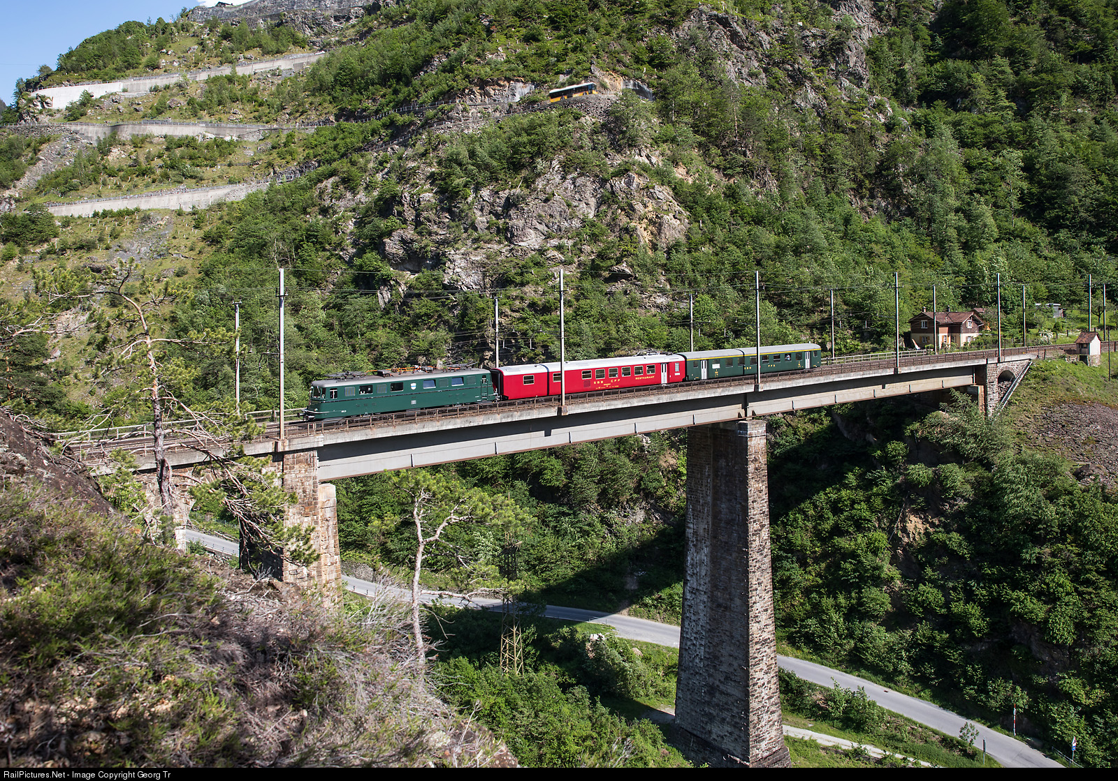 | Ae 6/6 # 11411 "Zug" of SBB Historic with the "Erlebniszug Nordrampe" from Göschenen to Erstfeld is crossing the 127 meter long and 53 meter high Chärstelenbach bridge between Gurtnellen and Amsteg-Silenen. Note the post bus high on the steep mountain slope on the narrow and curvy road to Bristen in the Maderaner valley. |