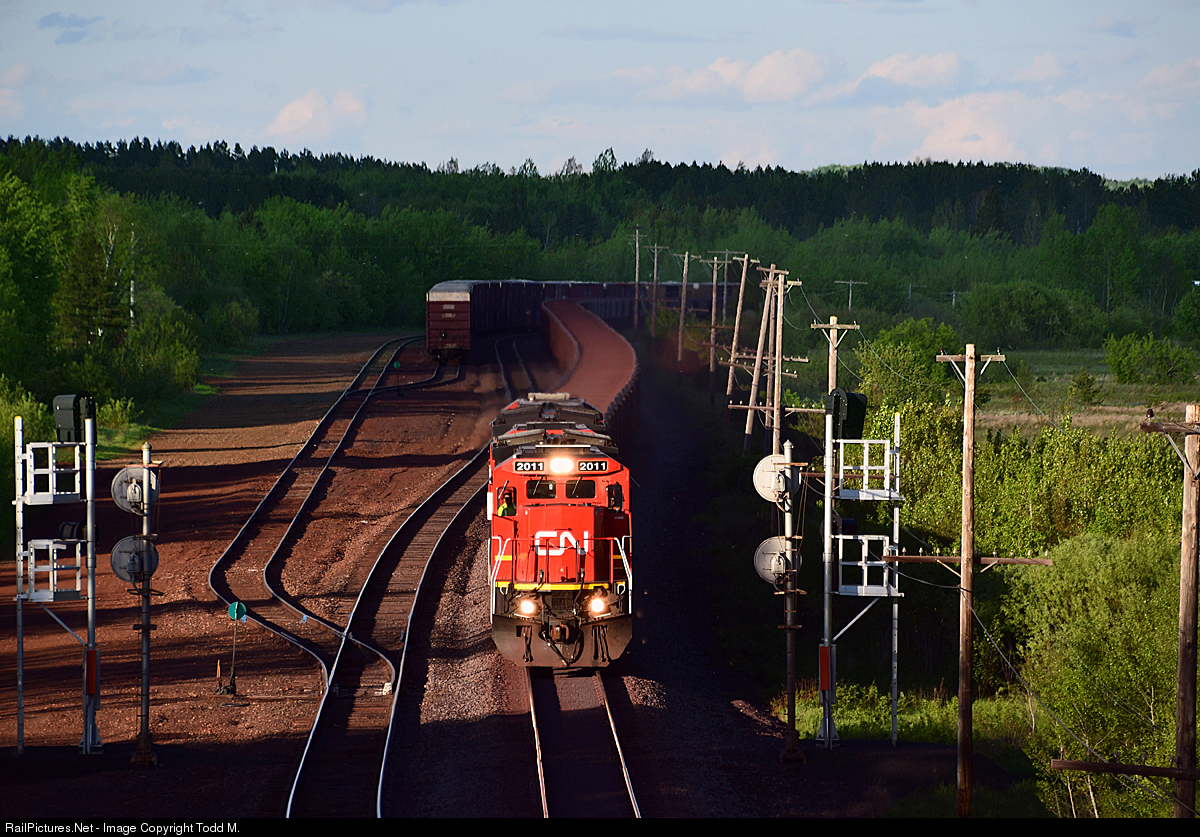 | Racing a setting sun and dodging clouds, CN 2011 eked out a sucker hole passing the signals at N. Biwabik on the trek from Two Harbors, MN to U.S. Steel Minntac to load taconite pellets. |