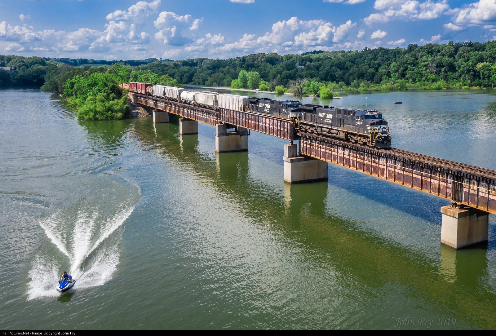 | Daily manifest train 123 crosses Douglas Lake in east Tennessee as it begins it's climb up to Asheville, NC. Im pretty sure the crew would have preferred to be on a jet ski rather than working on a warm summer weekend! |