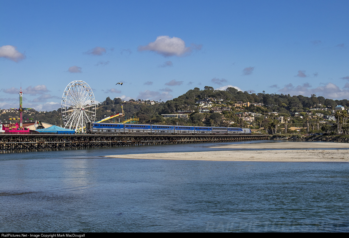 The Memorial Day edition of Amtrak 785 crosses the San Dieguito River and by the San Diego County Fairgrounds in Del Mar with a Goleta bound Surfliner consist.
