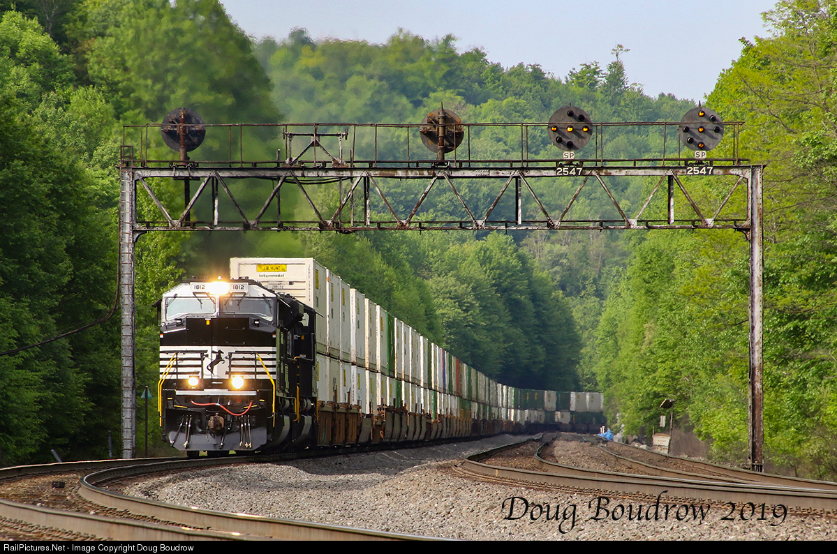 | An Eastbound intermodal train passes under the soon to be extinct intermediate signals in Lilly, PA on the NS Pittsburgh Line. |