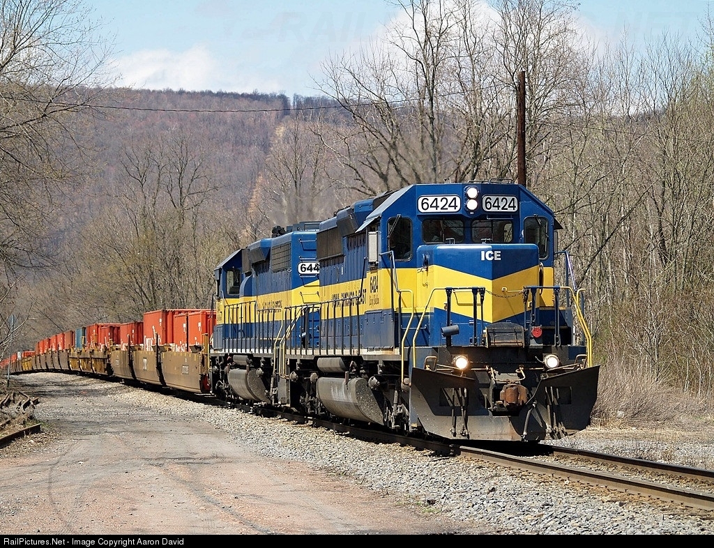 ICE on intermodal! Two Iowa, Chicago & Eastern SD40-2s lead CP 159 from Philadelphia through Nanticoke, PA. Seeing ICE units on intermodal was rare as most of the units were seen on either freight or ethanol trains. The grade coming up from the river into the city of Nanticoke can be seen in the distance.