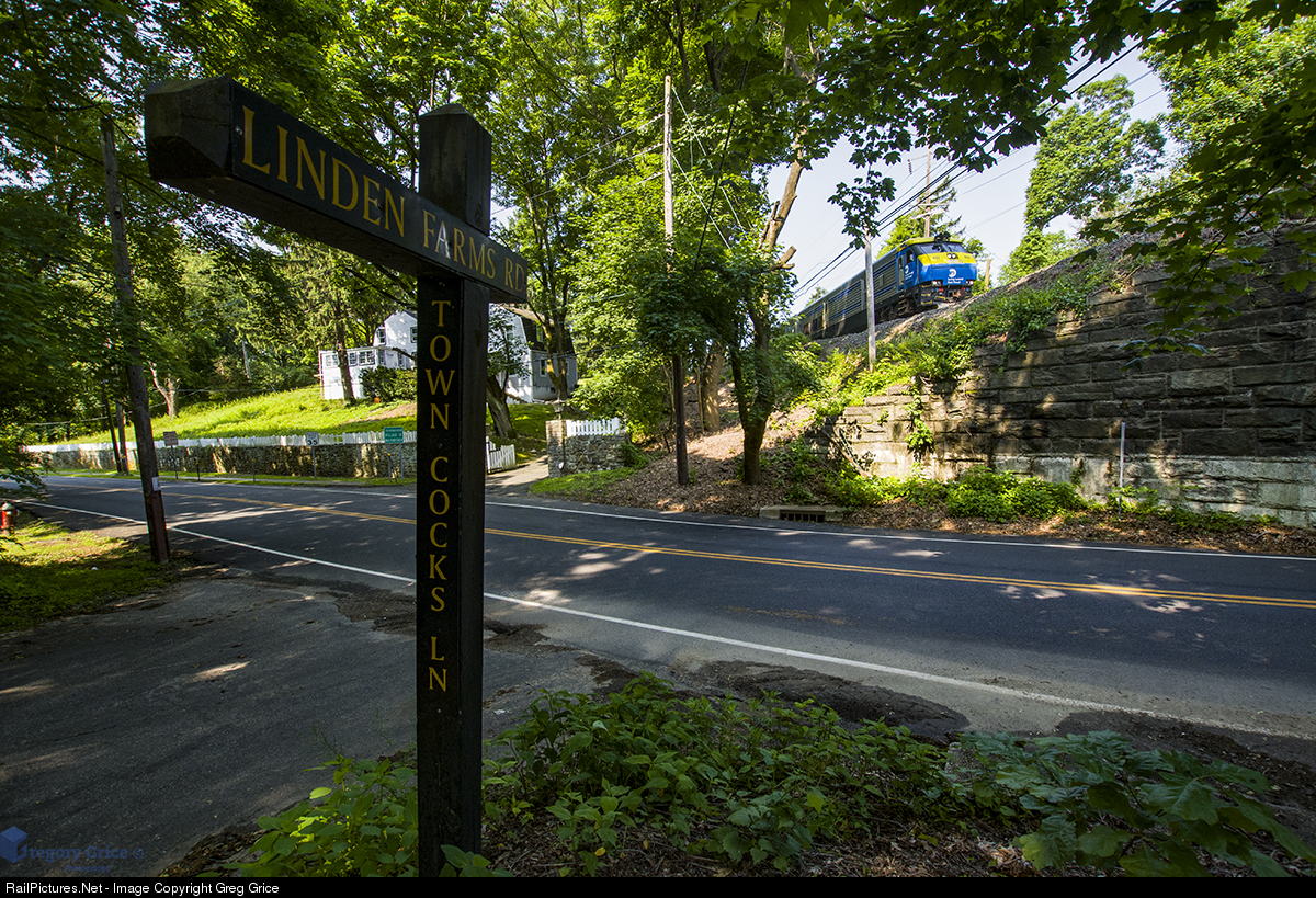 Long Island Rail Road train 502 heads east past Linden Farms Road in the small hamlet of Locust Valley on the Oyster Bay Branch.