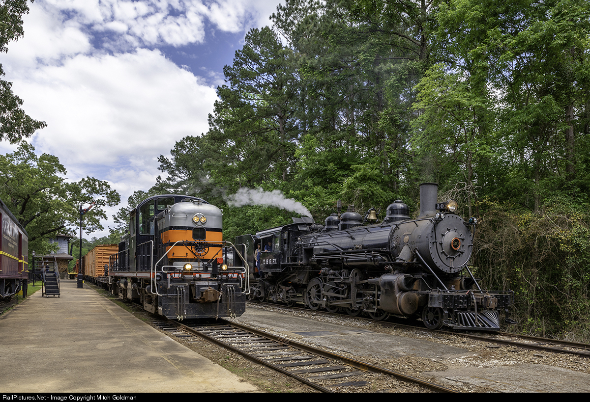 Tremont & Gulf 2-8-2 No. 30 leads its train past a stopped Southern Pacific local Charterville, Louisiana. In actuality, this scene was captured at Rusk, TX along the Texas State Railroad ROW and features former T&G #30 along side the railroad's 1947 built Alco RS2, former Union Railroad, now in a Southern Pacific inspired livery. Both railroads at one time had service in the state of Louisiana, but neither interchanged with each other. The SP livery was also worn by the Texas & New Orleans Railroad - the railroad that leased the original Texas State Railroad ROW from 1921 to 1962. Part of a Lerro Productions charter.