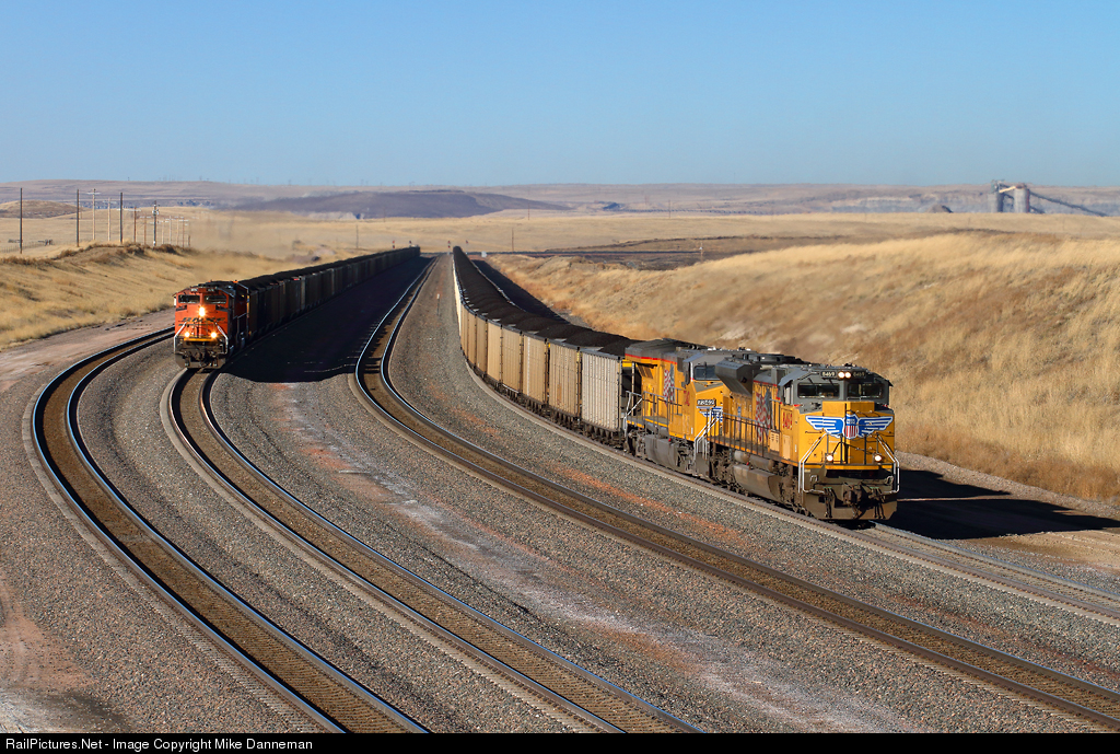 On the four-track main line over Logan Hill north of Bill, Wyoming, SD70ACe-led coal trains from both roads serving Powder River Basin put together a slow race over the top of the grade on the afternoon of October 18, 2018.