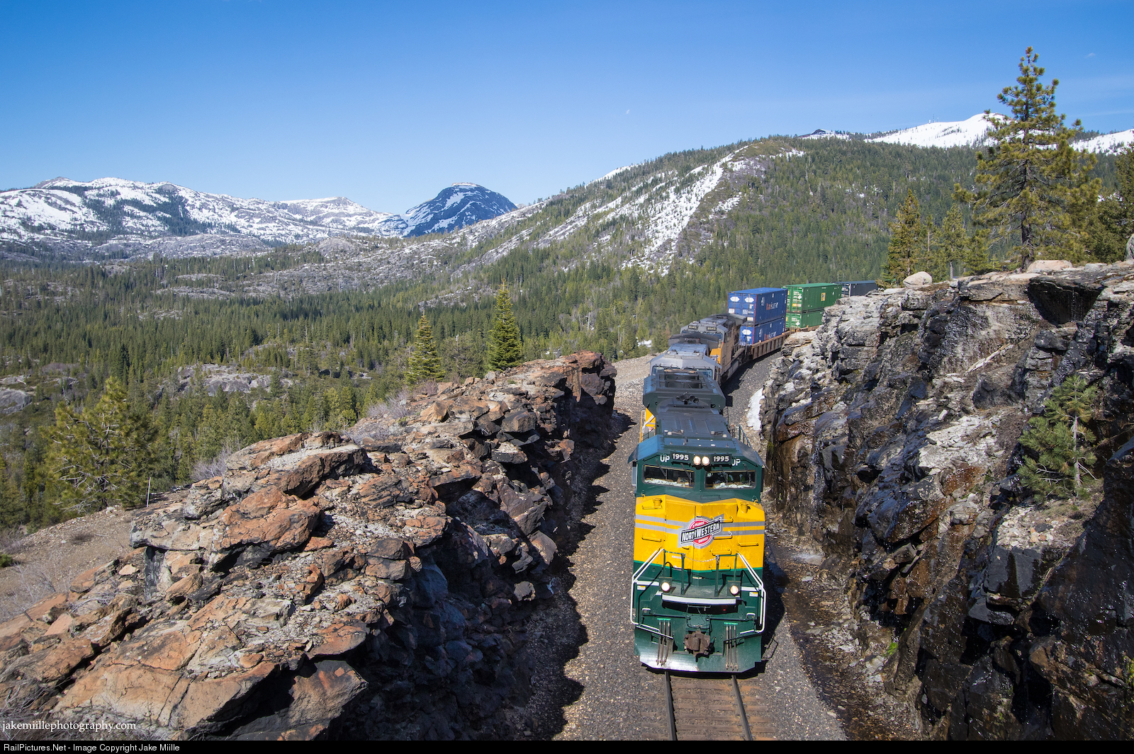 The Chicago & North Western Transportation Company (CNW) operated for over 130 years. Based in Chicago, this Class 1 Railroad primarily served the heart of the Midwest, including the states of Iowa, Wisconsin, Minnesota, Michigan, South Dakota and of course Illinois. In the late 1920's, the CNW constructed it's Proviso Rail Yard in the western suburbs of Chicago. With over 200 miles of track and the capacity to handle 20,000 cars, Proviso was once thought to be the largest rail yard of its kind in the world. In 1995, CNW Corporation was purchased and integrated into the Union Pacific Railroad. Today, Union Pacific has conjoined the Proviso Rail Yard with their large intermodal hub known as "Global 2". Together, Proviso and Global 2 make up one of the largest rail operation yards in the country. In this shot, Union Pacific 1995, which is specially painted to commemorate the CNW Railroad, leads the high priority "ZG2OA" over the Donner Pass Route. This train originated at Global 2 (Proviso), the once stronghold of the Chicago & North Western. Soon, this train will arrive at the Port of Oakland, completely the 2,000 mile journey across America.