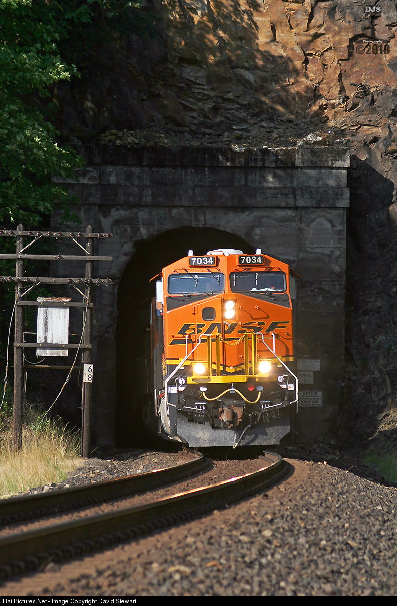 | BNSF 7034 east strolls out of Tunnel 3 in the scenic Columbia River Gorge on August 7, 2012. |