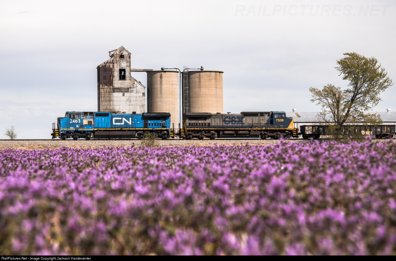 Sharing a nickname with Villa Grove’s “Blue Devil” mascot, a CN “Blue Devil” C40-8W leads northbound train X335 past Hayes elevator. The sea of purple flowers in the field is a nice photo prop and bee magnet!