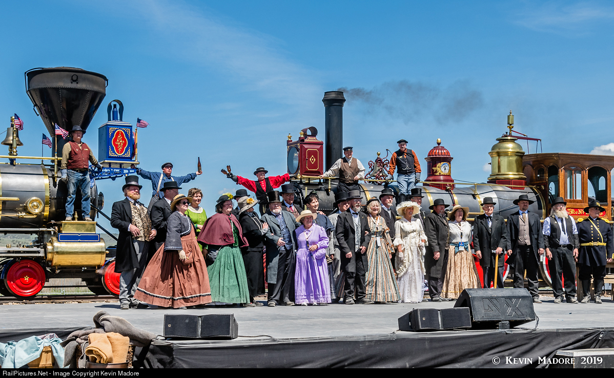 Without a doubt, the vast majority of the rail photographers who attended the Spike 150 ceremonies at Promontory Summit would likely tell you they came here for the "Champagne Photo"....a re-enactment of the iconic Andrew J. Russell photo, depicting the Chief Engineers of the two railroads, shaking hands in front of the two locomotives, with the engine crews and scores of railroad workers looking on. Unfortunately, with all of the speeches and presentations that were planned for the "Spike 150" event, it was pretty clear early on that this was not going to happen. A stage had been erected in front of the last spike location, and on the May 10th anniversary, that stage was crowded with an orchestra, a children's choir and all manner of TV equipment, including a huge boom camera. Those looking for a "Champagne Photo" on the 10th likely left disappointed. But on the following day, the situation was a tad more conducive to photography. Gone was the orchestra, the choir and all of the crazy media and their equipment. There were still probably 10,000 spectators, but the atmosphere was much more relaxed. When the morning edition of the re-enactment was completed, many of the folks who were in period dress were called forward to participate in a quick photo op, which you see here. It wasn't exactly the photo we were all looking for, but it sure beat anything we could have gotten the day before. My one regret is that some of the Chinese, Irish, Mormon, African American and Native American re-enactors who had been there the previous day, were not in attendance this morning. The 2019 ceremonies had focused heavily on telling the stories of the key players who did NOT appear in the 1869 Russell photo. It would have been pretty cool to include them in the 2019 rendition of the "Champagne Photo." Perhaps we can do that some day with a photo charter at the park.