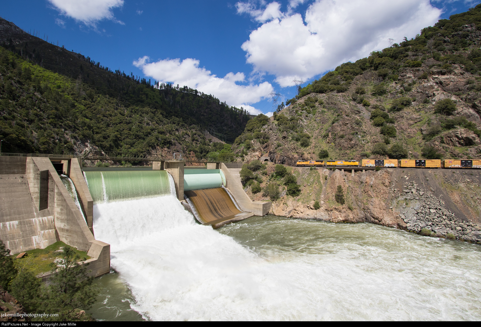 PG&E's Hydroelectric infrastructure often dominates the scenery of the Feather River Canyon. Producing some of the cleanest energy in the country, PG&E's dams, powerhouses, tunnels and conduits capture the energy of the Feather River and transport it to customers all across California. The Rock Creek Diversion Dam, which sits just west of the small town of Belden, California, captures and transports water 6.3 miles to the Rock Creek Powerhouse. It is there that PG&E is able to create 123 megawatts of electricity or enough power for over 90,000 homes. Hydroelectric power is clean and reliable. Recently though, PG&E's operations in the Feather River Canyon have come into question. In November of 2018, it is believed that high tension power lines (which carry electricity out of the canyon) sparked the devastating Camp Fire. Many have questioned whether PG&E's operations are worth the risk of wildfire. In this shot, water cascades over the Rock Creek Diversion Dam as a 5,155' Canyon Crawler grinds eastbound up the Feather River Route. Heavy snow and rain have turned the typically docile waters of the Feather River into a raging torrent.