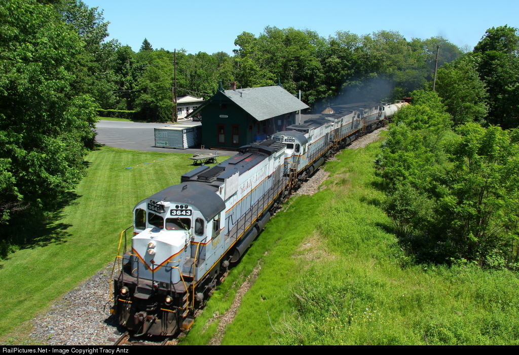 D-L 3643 leads westbound PO75 through Cresco while returning from a now rare run down to Slateford Jct, PA. The solid "corporate scheme" lash-up has only eight cars in tow until they reach the mill at Mt. Pocono.
