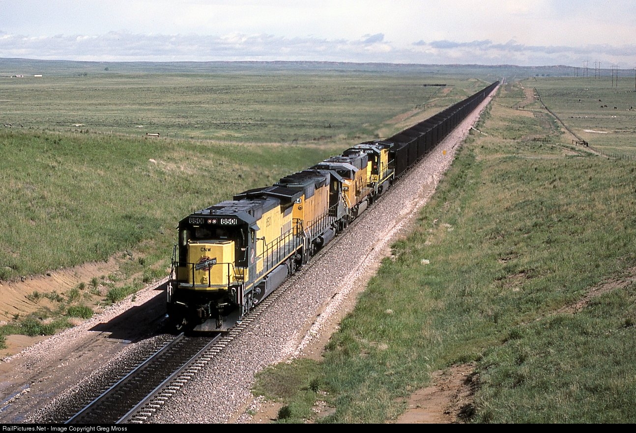 CNW 8501 is about to duck under the Hwy 59 overpass bear Bill, WY in May of 1991. There are now 4 tracks at this location to handle all the coal traffic.