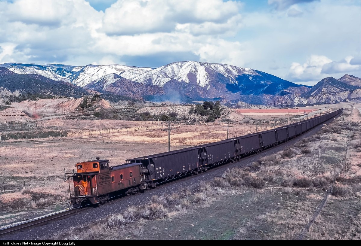 | Like many Rio Grande cabooses in this era, this one is showing evidence of years of service on coal trains and passing through many tunnels. Here it continues its streak on an eastbound coal train ay New Castle, Colorado. |