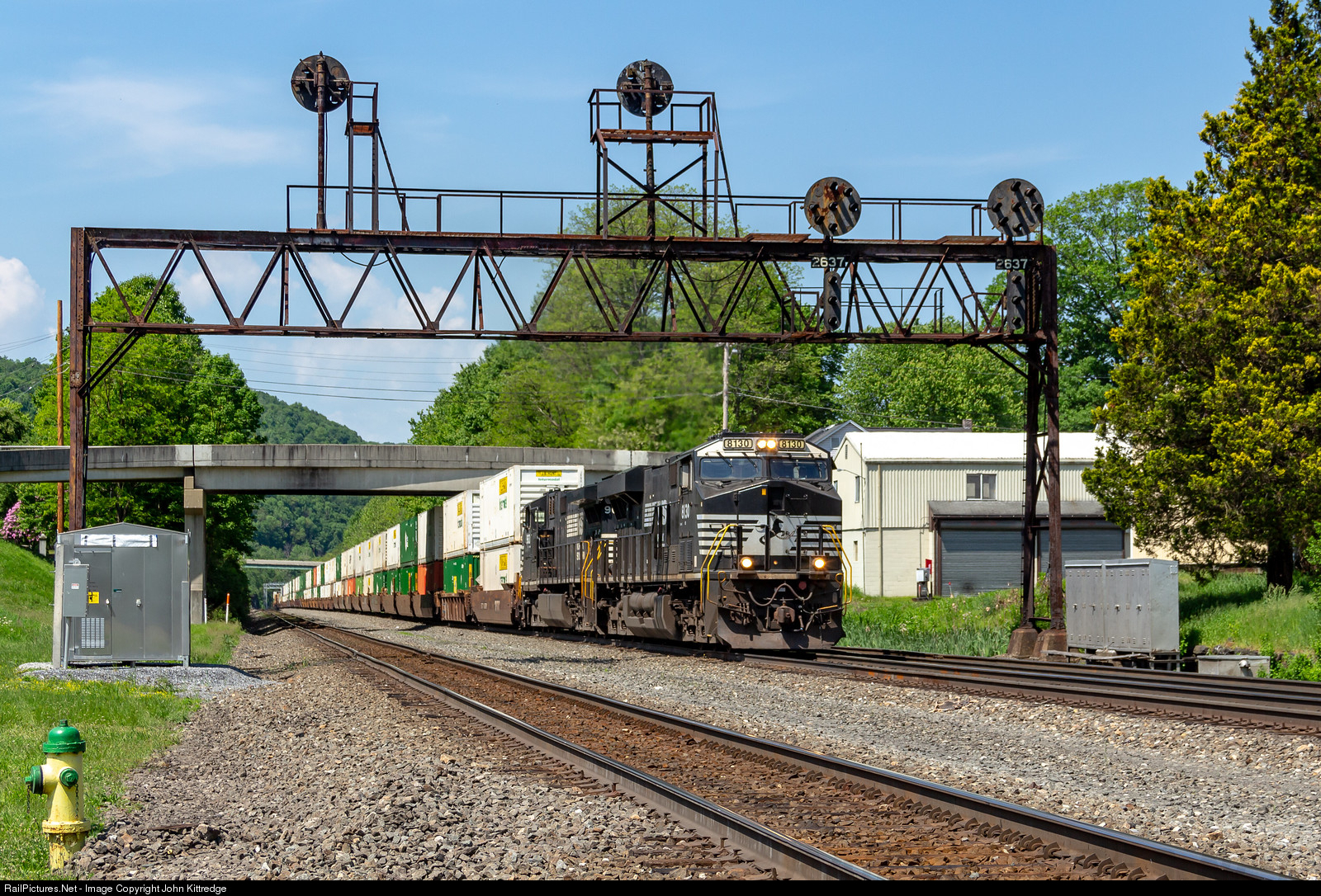 | The impressive PRR signal bridge in Summerhill is on borrowed time, supposedly falling this Sunday. A few weeks ago, a hot NS intermodal train with a pair of ubiquitous wide cab GEs charge under the endangered structure. |