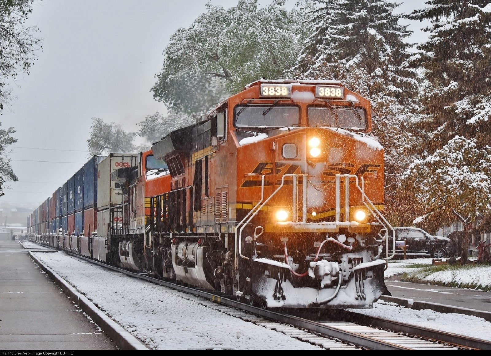 | A tier 4 BNSF 3838 (ET44C4) leads a double stack train up Atwood Street in Longmont, Colorado during the last spring snowstorm of the season. |