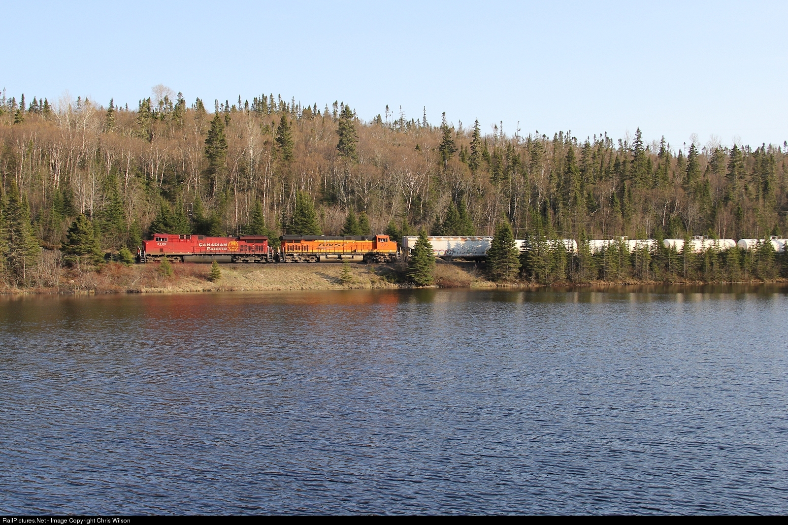 CP AC4400CWM 8100 + BNSF ES44C4 6615 haul 112 along the shore of Ripple Lake
