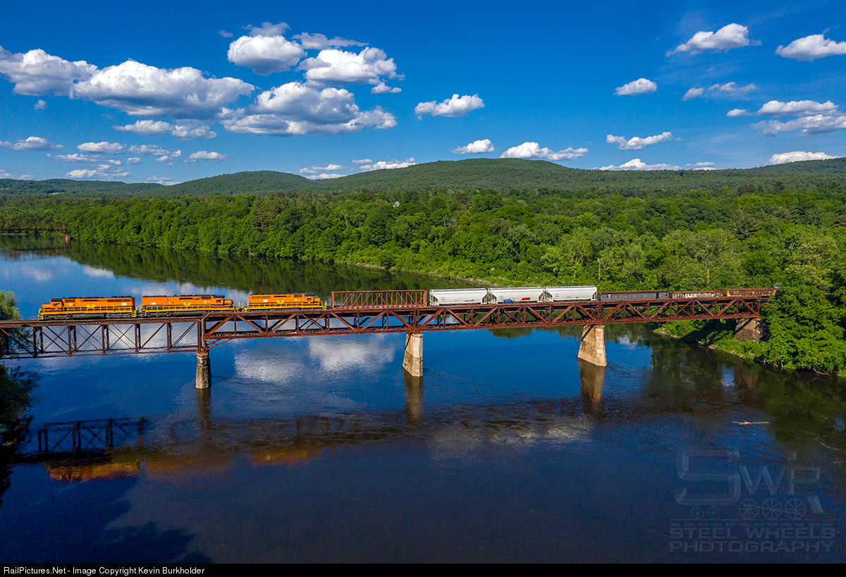NECR 611 Crosses the Connecticut River from Northfield to East Northfield, MA (yes on the west shore of the river, nobody knows why East Northfield is west of Northfield!) on June 7, with 3 of a kind... all SD40M-2s now but 3474 is a SD45 carbody,3317 a SD40T-2 and 3478 a SD40.