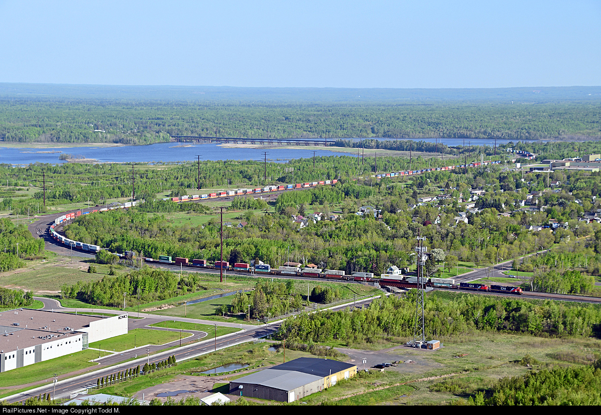 | Slowing to a stop at the base of Steelton hill, this dual EMD powered stack train will wait for the shovers to attach to the rear of the train to assist in making a hard charging run up the nearly 2% hill and continuing towards Canada. Note: no drone shot here, only used what nature provided and the city of Duluth developed in the form of Skyline parkway. |