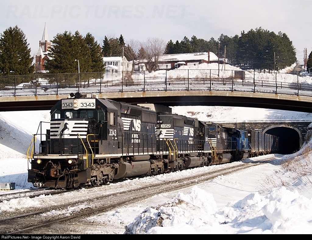 With a helper ahead, NS 65J roars out of the Gallitzin Tunnel on a cold February morning. These trains always received a helper ahead on them. Note the helper is still two SD40-2s, a dying breed on the mountain as new rebuilt SD40Es started to take over the helper duties.