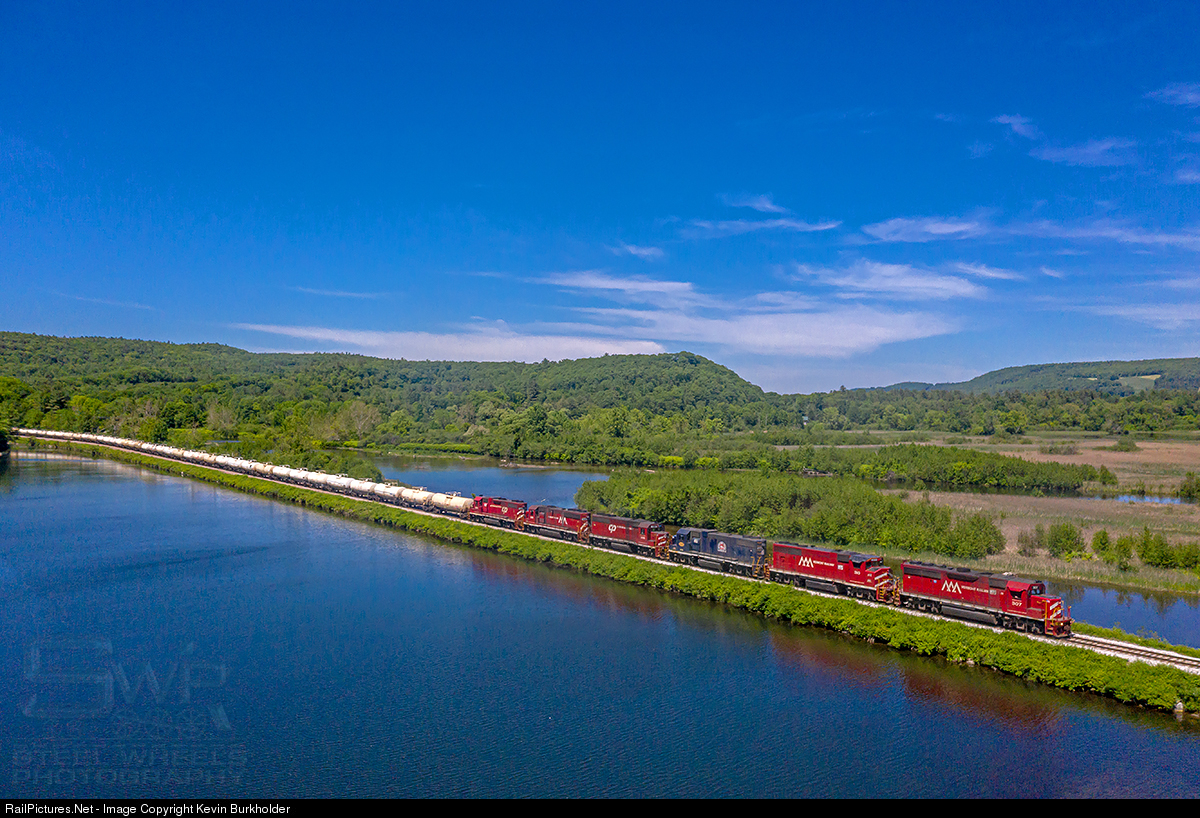 Vermont Rail System's Saturday slurry (and salt) train 263-08 required a 6-unit consist to move 63-cars and 8,190 tons up the nearly 2% grade from Rutland to the summit of the Green Mountains at Mt. Holly on June 8. The train is seen at the eastern end of its run as it arrives at Riverside Yard in Bellows Falls with an all-VRS family consist that includes VTR GP40-2 307, GP40-2L 310, VTR GP38-2 202 (Washington County paint), CLP GP40-2 306, VTR GP40-2 308 and CLP GP38-2 204.