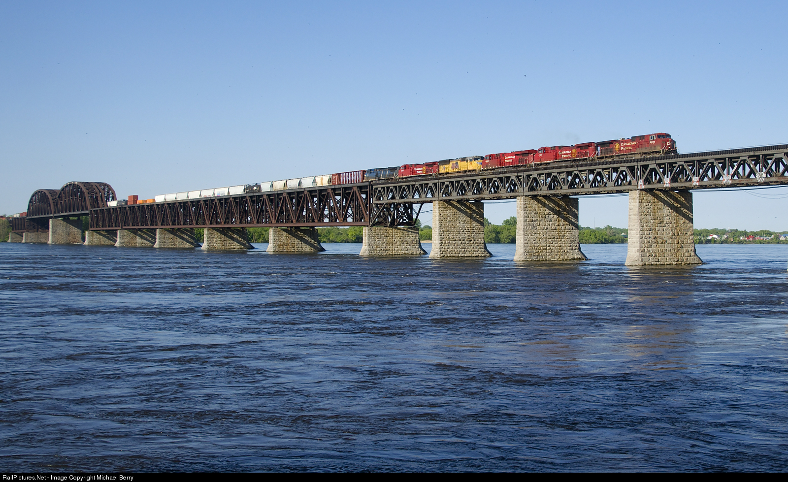 CP 253 has 6 units (CP 8600, CP 8126, CP 8925, UP 3911, CP 8016 & CEFX 1032) and 77 cars as it crosses the St. Lawrence River towards Montreal on a beautiful morning.