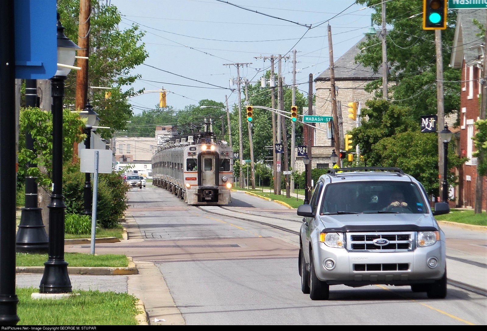 Street running action scene on the South Shore Line at 11th & Wabash in Michigan City.