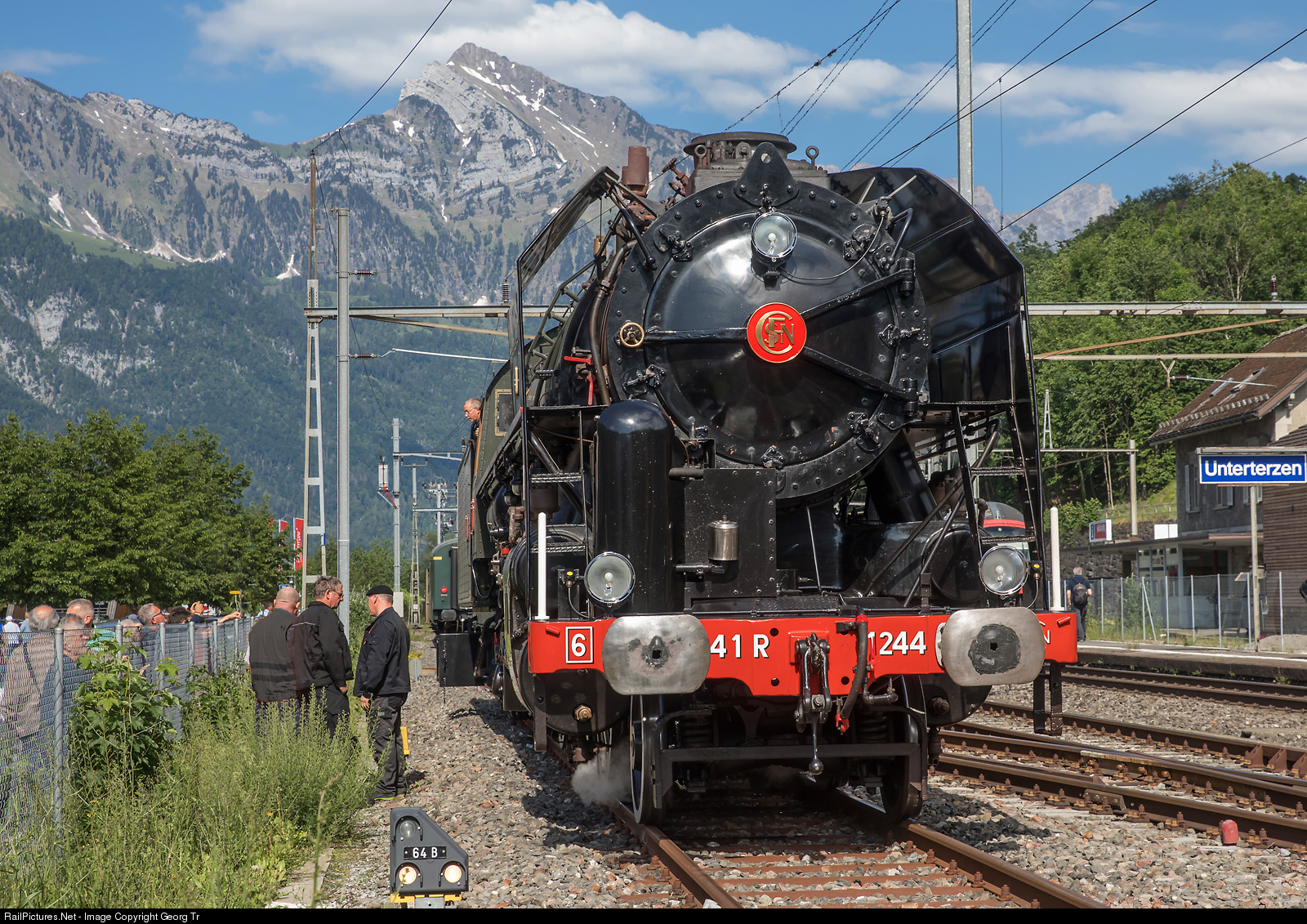 The canadian built, former french railway SNCF, heavy fuel oil fired, 2-8-2 "Mikado" 141 R # 1244 of association "Mikado 1244" at Brugg (AG), is pulling the "HAG-Reisen" charter train round the Säntis this day. In Unterterzen, there was a long stop for a motorboat trip to the restaurant at Tiefenwinkel for lunch. The locomotive got water and is now ready to run around the cars for the onward journey, tender first running, to Sargans. From there, the locomotive will pull the train through the Rhine valley down to St.Margrethen, along the Lake Constance (Bodensee) to Rorschach, then up to St.Gallen and finally back to Brugg (AG). In the background is the 2259 meter high mountain called "Sichelchamm" (sickle ridge).