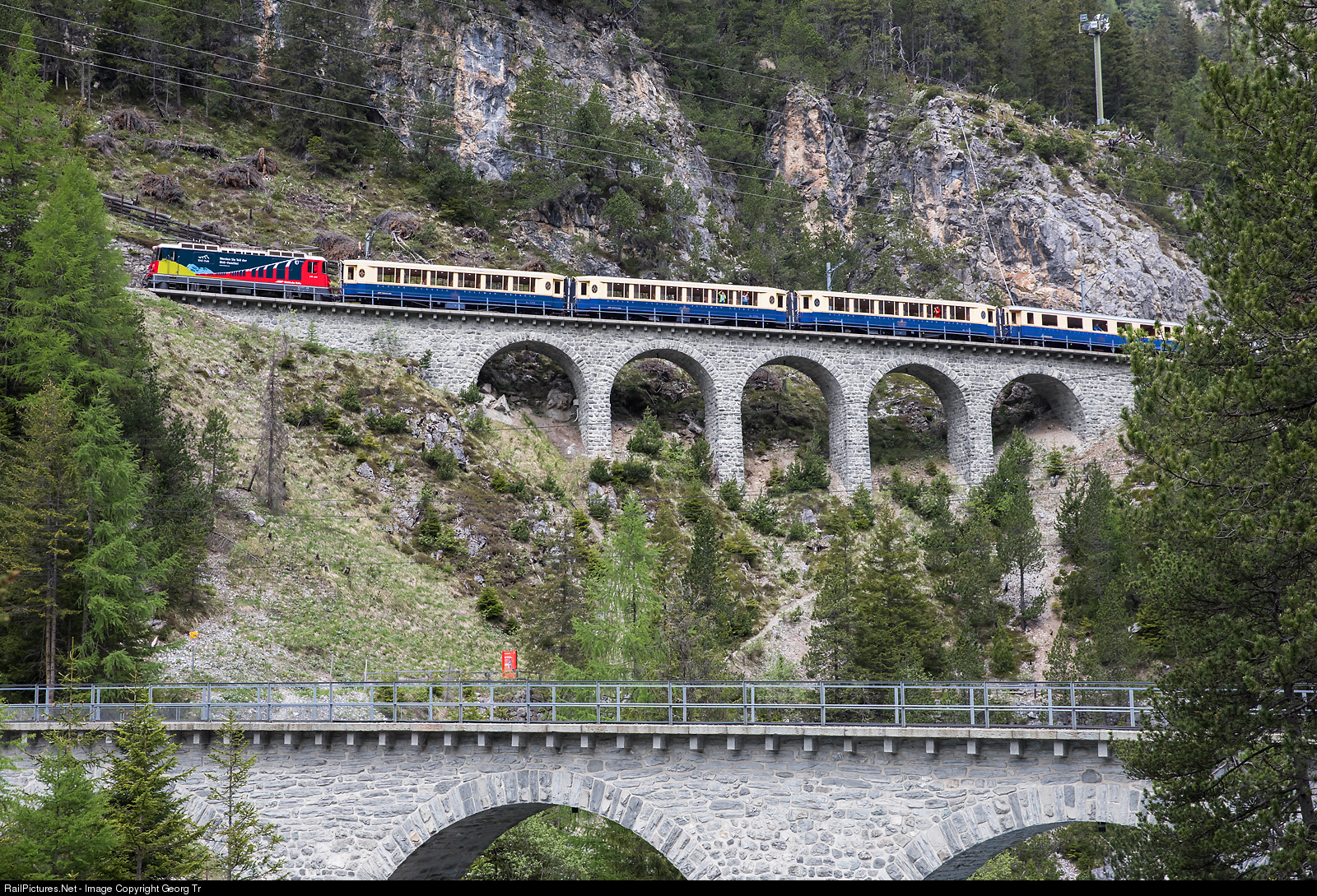 | Ge 4/4 II # 620 "Zernez" in the publicity paint scheme for the "RhB Club" is pulling the parlor car train 2121 from Landquart to Samedan over the 74 meter long Rugnux viaduct between Muot and Preda on the Albula line. In the foreground is the 59 meter long Albula I viaduct, which crossed the train about 1 minute before. The train got about 25 meter hight through the 662 meter long Rugnux spiral tunnel in this "staircase". |