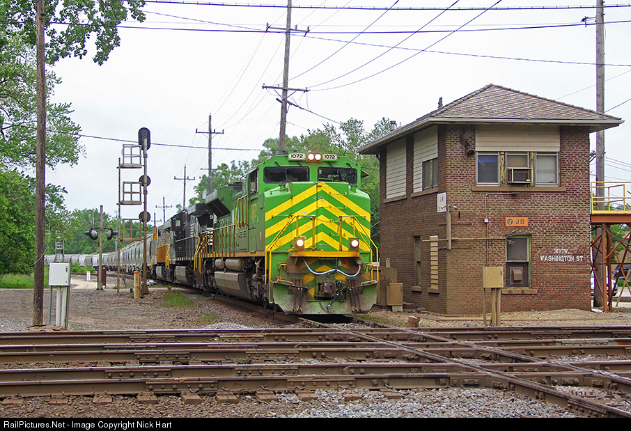 | Illinois Terminal painted SD70ACe 1072, known as the glow worm, passes JB Tower on its way south down the old EJ&E. |
