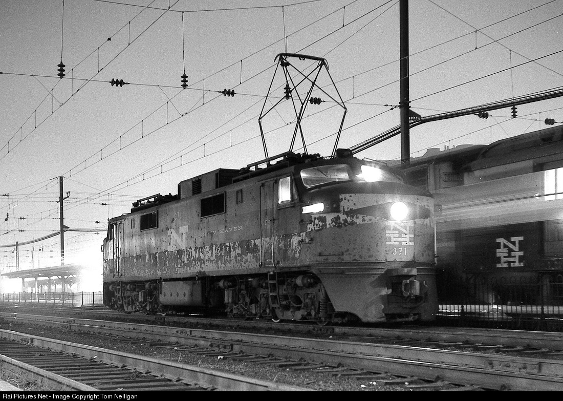On the New Haven Railroad's final night, in the line's headquarters city, EP-5 electric 371 awaits its next run to Grand Central terminal. The horrible condition of 371's paint symbolizes a railroad that has reached the end of the line, with a Penn Central takeover imminent.