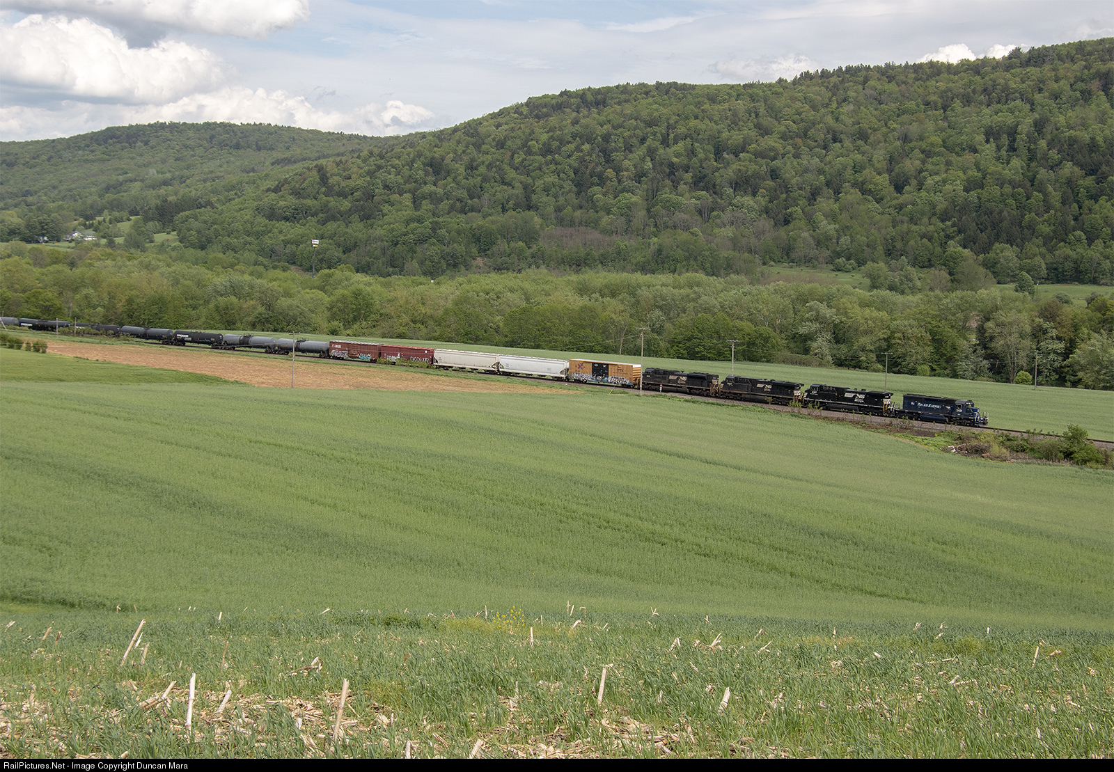 NS 11R runs south on the D&H South Line across a corn field in Otego with a Pan Am SD40-2 leading a pack of NS engines.