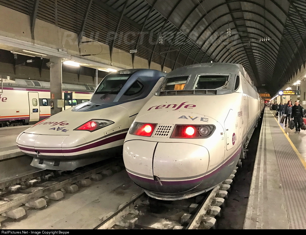 | High-speed AVE train RENFE 100-010 parked at the Sevilla Santa Justa station, waiting to leave for Madrid Atocha station. |