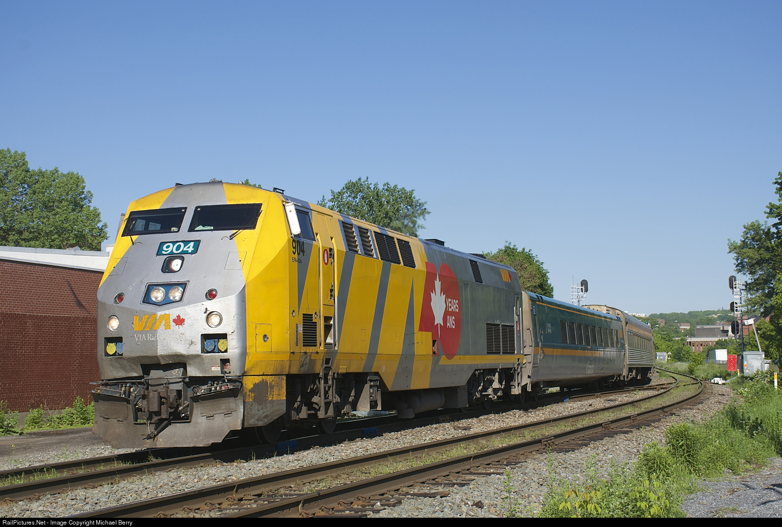 | VIA 904 leads VIA 22 past MP 3 of CN's Montreal Sub on a sunny morning. Barely visible above VIA 904's exhaust is the clear signal for VIA 601/603, which will pass just after VIA 22. |
