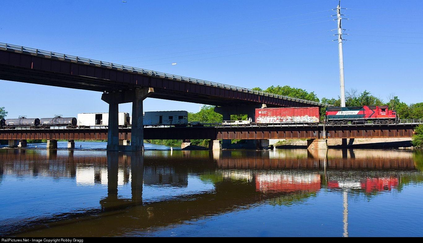 Ferromex GP38-2 2046 leads the weed sprayer west across the Fox River in Elgin.